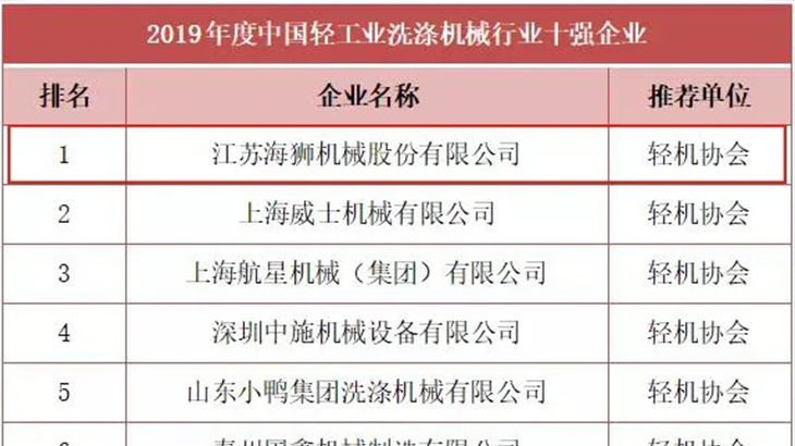 近日,中國(guó)輕工業(yè)聯(lián)合會(huì)揭曉了2019年度中國(guó)輕工業(yè)百?gòu)?qiáng)、輕工業(yè)裝備制造五十強(qiáng)、行業(yè)十強(qiáng)榜單,海獅機(jī)械榮登雙榜單。五十強(qiáng)年度中國(guó)輕工業(yè)裝備制造行業(yè)五十強(qiáng)榜單由中國(guó)輕工機(jī)械協(xié)會(huì)推薦的有22家企業(yè)榮登2019年度中國(guó)輕工業(yè)裝備制造行業(yè)五十強(qiáng)榜單,海獅機(jī)械排名第13位。行業(yè)十強(qiáng)年度中國(guó)洗滌機(jī)械行業(yè)十強(qiáng)榜單由中國(guó)輕工機(jī)械